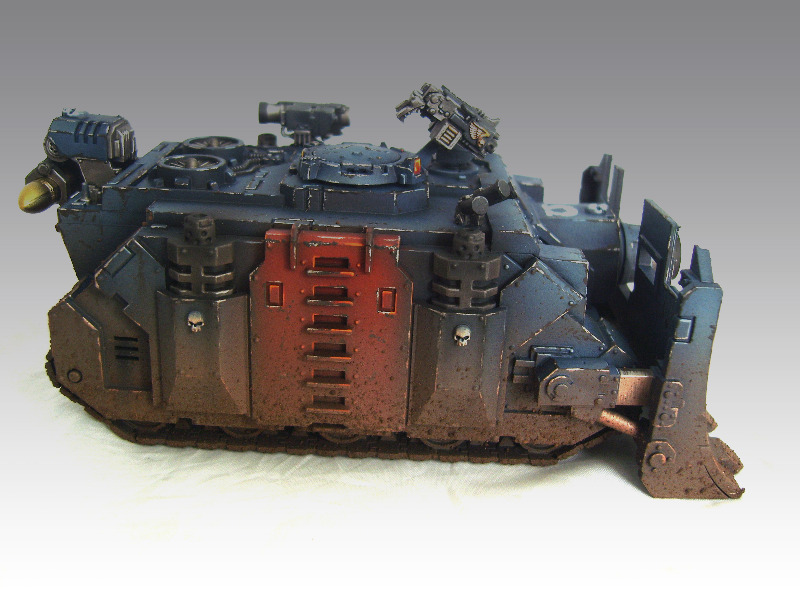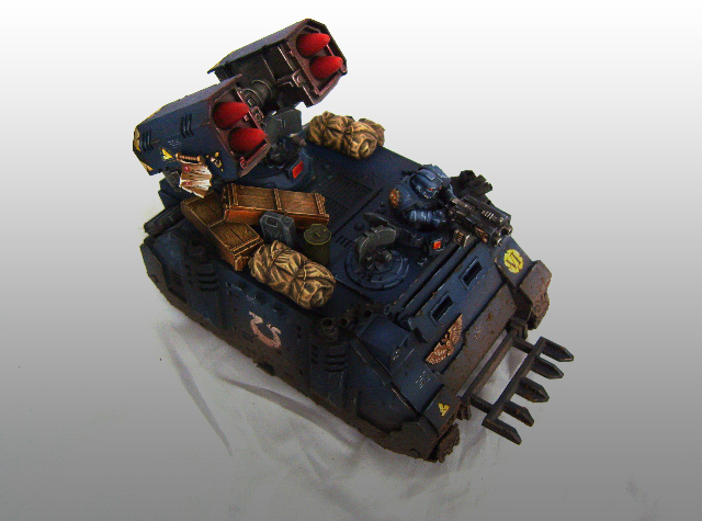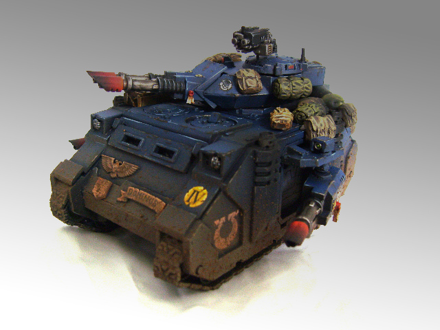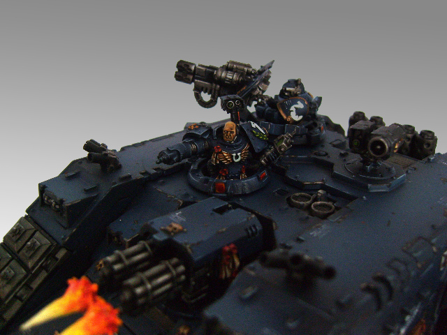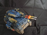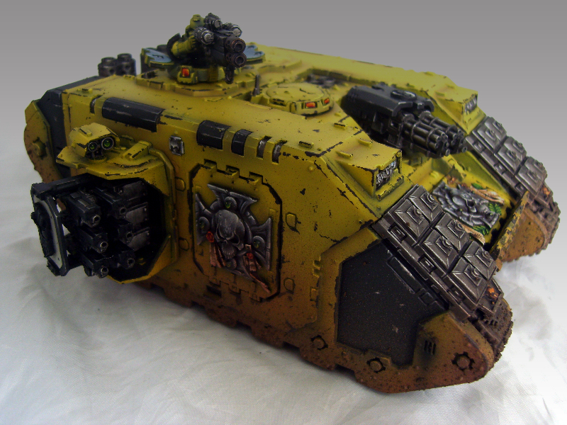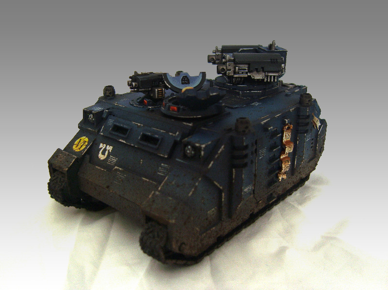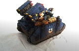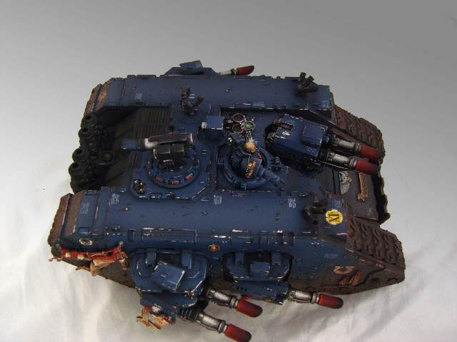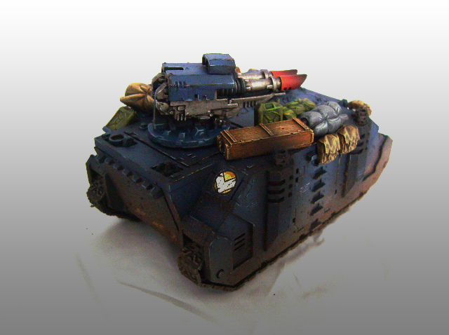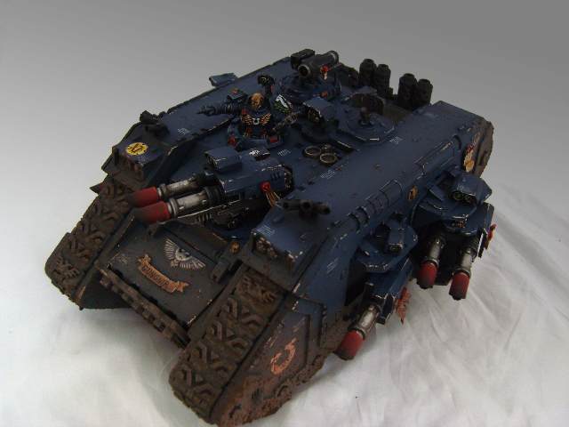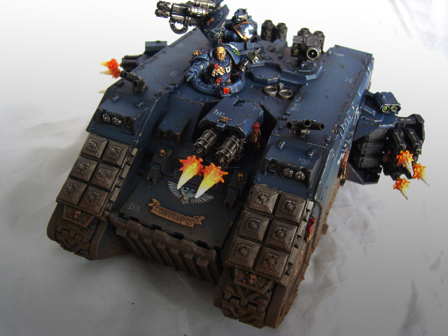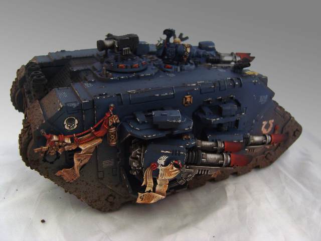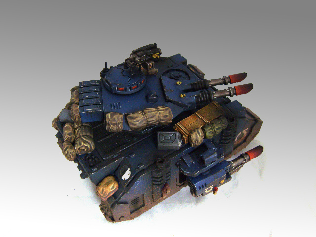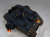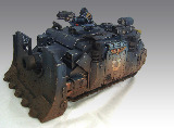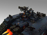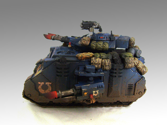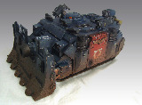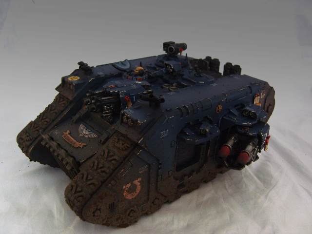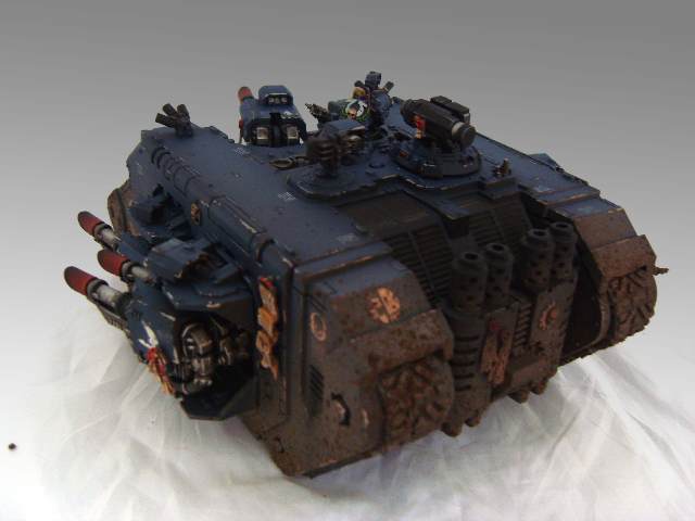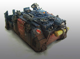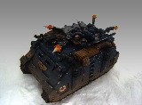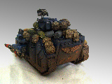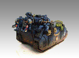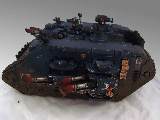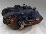 Last of the heavy armour. The land raider Terminus. Typical, bigger guns come along and Chronus is straight into the commanders seat! The weapons are held on using magnets which allow it to be quickly converted into a passable standard raider |