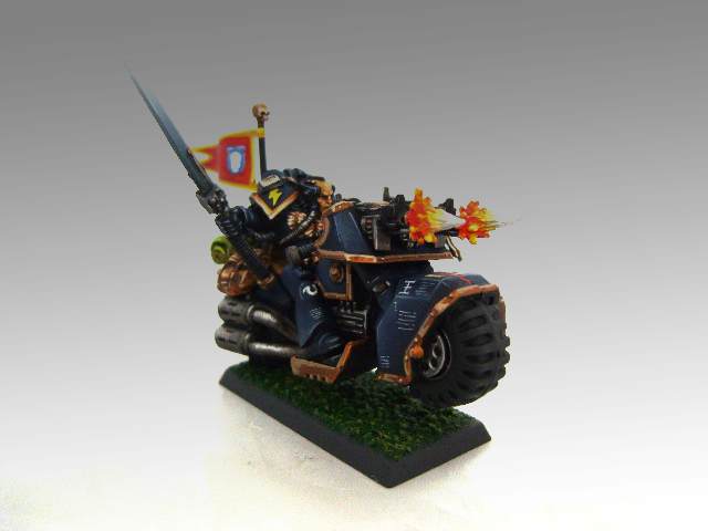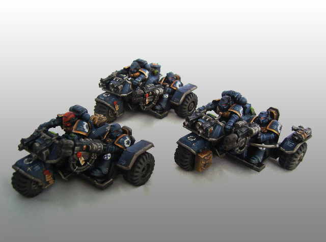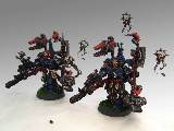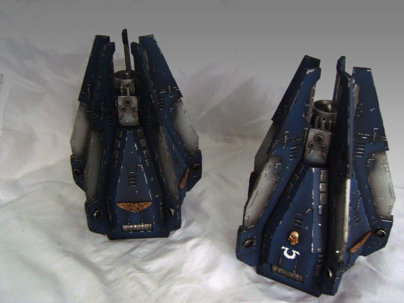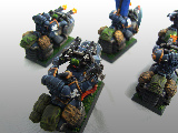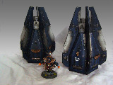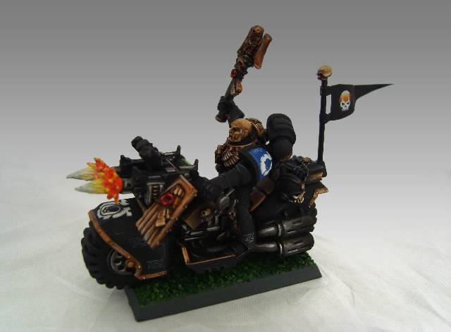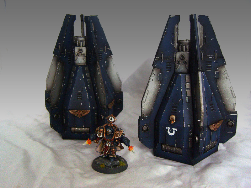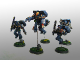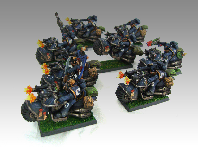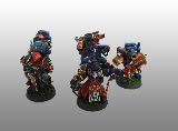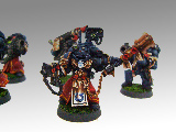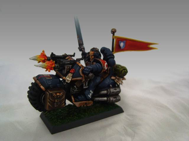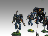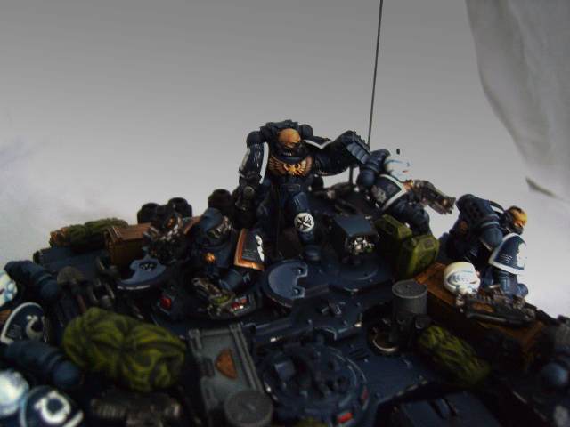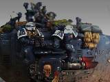 When a fella simply runs out of the right coloured paint pots Well, cut a long story short, a while ago I bagged some amazing converted Dark Angel miniatures from ebay on an Impulse purchase. Wanting to do them justice and admittedly annoy the bearded ones out there I decided there was only one option and that was to paint them blue! Lack of the correct GW pots led me to make do with the tamiya colours I had (little darker than the codex some might say). What we ended up with is a new chapter because I am simply too lazy and too tight to buy the required paints The Origin of the Crimson Ultrawings! The crimson Ultrawings are unlike any other marine chapter, chosen for their grim determination and no-nonsense attitude they are drawn from several main chapters, often called in to situations that require brute force and a direct, some might say suicidal, approach Most missions call for the marines to be deep behind enemy lines, detached and out of touch with supply ships and higher command for long periods they are granted a certain amount of autonomy and must carry most of the supplies needed for the mission in hand, for this reason they often travel with several armoured vehicles to aid with support fire/logistics It is rumoured that the original geneseed for the mainstay of this fighting force was taken from a small area of Terra known as ‘The North' This could be the explanation as to why the Crimson Ultrawings have been reigning champions of the inter-chapter drinking game since it began. It could also suggest an origin for their legendary and deadly war whippets The unit motto is “First ones in, last ones out” No place for a lady Sister Anabelle grimaced as she dived behind the barricade, enemy fire shredded the wall where she had been stood a second ago. Things were bad, things were VERY bad. Her small scouting force was down to three sisters of battle, ammo was nearly gone and the Eldar closed in from every side. WHERE were the re-enforcements she had requested WHERE! She peered over the barricade; suddenly shapes she recognized broke the distant gloom. MARINES! Captain Samuel peered into the gloom, his bionic enhancements highlighted areas of the battle scarred terrain that his normal vision could never have analyzed. In an instant his military mind had concocted a superior battle plan based on the positions of the enemy units he had scanned. “Alpha squad, spearhead the left flank, Gamma fall back follow on right flank, suppressing fire. Chosen ones prepare to deep strike on my mark” He stopped, drew a deep breath and raised his sword…..”IN THE NAME OF THE EMPORER” his sword fell forward pointing towards their quarry “CHHAAAAAAAARRRGGGEEEEE” An explosion of blue sprang from the smoke, Alpha squad fired up the jump packs, in an instant they where upon the Eldar, chain swords did their butchering, limbs fell and screams filled the air. To the right the Devastator squad opened up with their heavy weapons, a torrent of lead, laser and plasma was emptied into the large group of Eldar warriors ahead, they dived for cover, enough time for Samuel's squad to cover the open ground between them. Bolt guns screamed into life tearing into the enemy and Samuel's squad engaged the remaining warriors in a deadly melee. He scanned his surroundings, as he suspected the Eldar had held reinforcements in cover, they broke from their hiding hole and made for the swirling melee of blood and guts Samuel blocked a heavy blade and plunged his sword into the owners torso, driving it deep he raised his boot and kicked the limp body from is bloodied weapon, he deftly reached for his belt, pulled a marker grenade and threw it towards the rapidly advancing Eldar re-enforcements “Chosen ones, on my Marker NOW” For a split second the battlefield was illuminated by a blue haze, the smell of ozone filled the air; the chosen ones shimmered into existence. Two Eldar shuddered to a halt, their last vision being that of the lightning claw plunging into their chests. A booming voice could be heard even above the sound of screams and bolter fire “AHAHAH ANYONE FOR A KEBAB!” Sergeant Blessed roared with laughter at his own joke, with a swift motion he flicked the two Eldar from his clawed hand. Around him the rest of his terminator force had already engaged the terrified enemy, beneath the onslaught of hammer and claw they stood little chance. Captain Samuel pushed forward towards the sister's position; little opposition stood before him now, the execution of his battle plan had been swift and brutal. Suddenly a blur of colour flashed from his right, flashing blades danced before him and there stood an Eldar harlequin “Your honour marine, shall now be the death of you for I challenge you by trial of combat the right to take this field, I know your traditions pig now prepare to DIE” His blades flashed trough the air with supernatural speed, he danced them around before Samuel in a show of dexterity and combat prowess that would have put the fear of God into any man. “This battlefield shall be MIN…” As he finished his sentence a clean round hole appeared in his forehead, the harlequins eyes looked up and crossed in a vain attempt to register what had just happened. A second later the rest of his body caught up with the fact that he was dead and crumpled into a lifeless heap, swords clattered to the ground Captain Samuel looked down the barrel of a smoking bolt pistol, turning to face his men he growled at them “I don't fight men who wear tights” Kicking the fallen Eldar aside he led his men forward towards the barricades. Before him the sisters arose, they raised their weapons and cheered their saviors. Samuel approached the leading sister, holstering his gun he looked her up and down and a smile cracked open his face “Make Yer'sen useful old love and get kettle on, ‘am bloody parched'