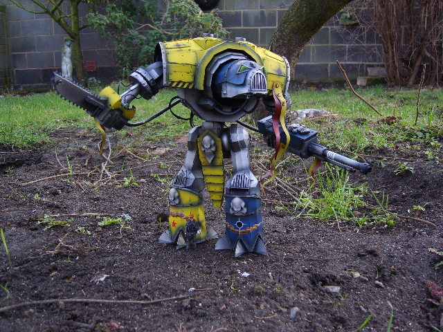 Then he looked up from the console and to his amazement the Chaotic horde was retreating away from him and in the blink of an eye it turned into a route, suddenly to his left he saw a bright light and seconds later felt the earth tremble beneath his feet, a hundred chaos troops ceased to exist. Spinning the Duke round he felt a shadow fall over him and the sky darkened, he couldn't believe what he saw, striding over him an Imperial Warlord Titan, gigantic guns blazing instant death to everything that opposed it. Something drew his attention to the right, two Imperial Warhounds passed by at amazing speed, crushing troops beneath their feet and spitting death from their weapons they seems to be volleying for best position to spread destruction. To his left a larger Reaver class strode into view, it turned its head towards him, it raised its house sized fist pointed ahead and let loose with a volley from its Gatling blaster. Tex suddenly came to his senses, He spun the Duke around and re-joined the battle, and ‘this only happens in the movies' he thought to himself as he cleaved a couple of Chaos spawns in two.