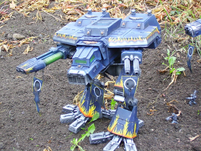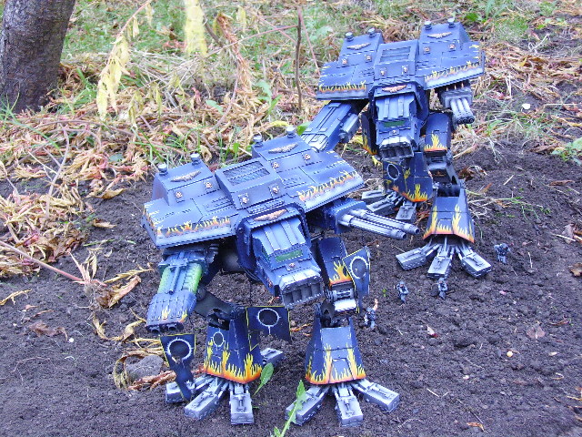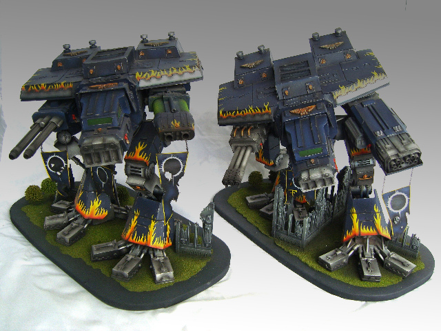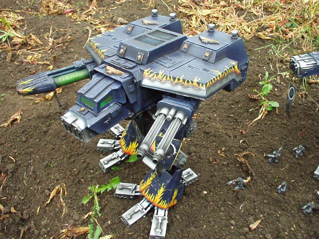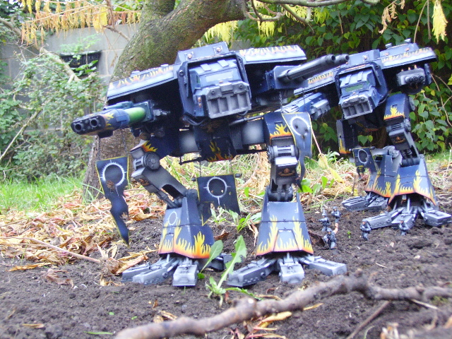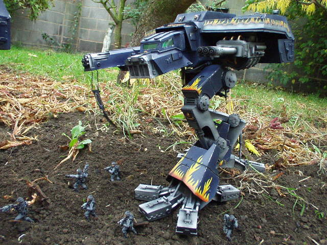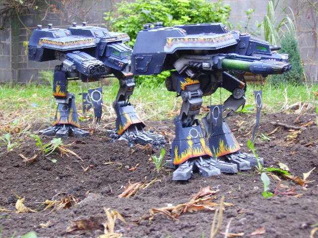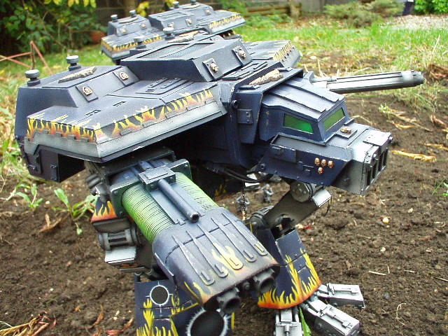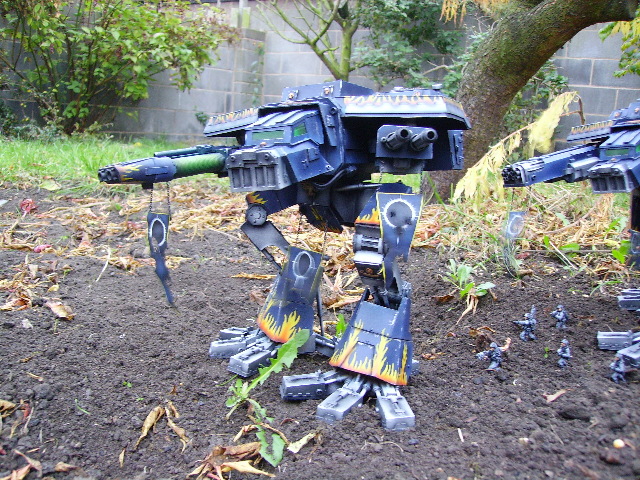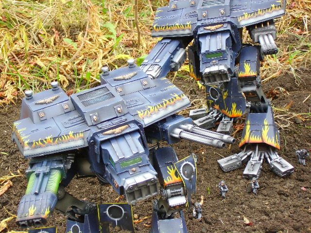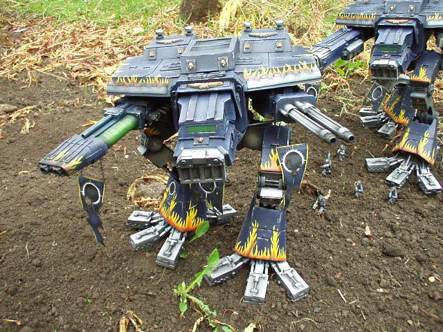 These are both scratch-built using cardboard and plastic. Took a weekend to build the 1st then a couple of days to complete Warhound no2. I kept the paint scheme relatively simple relying on there size to impress on the battlefield, in fact they were painted from undercoat in a couple of afternoons!!