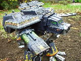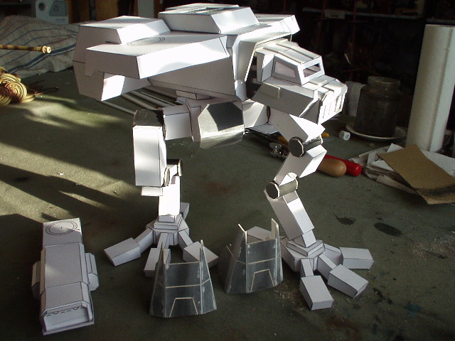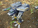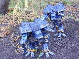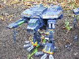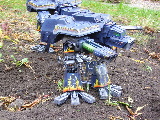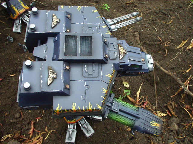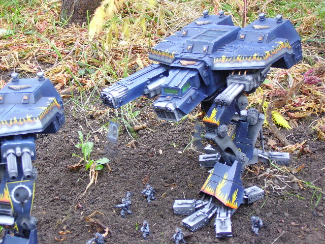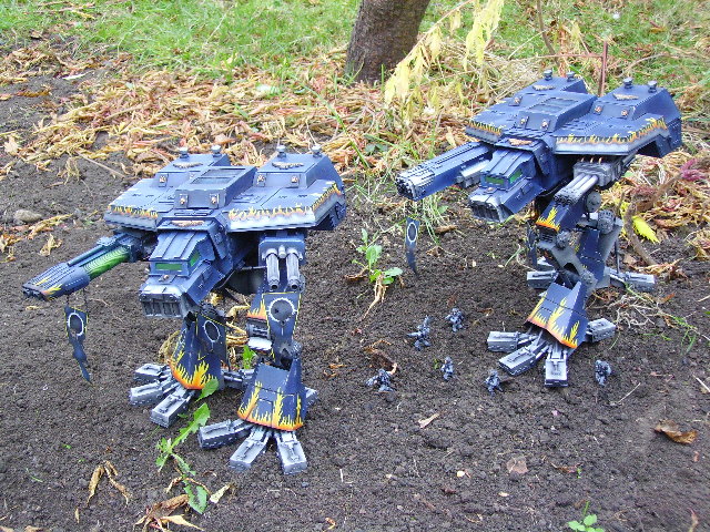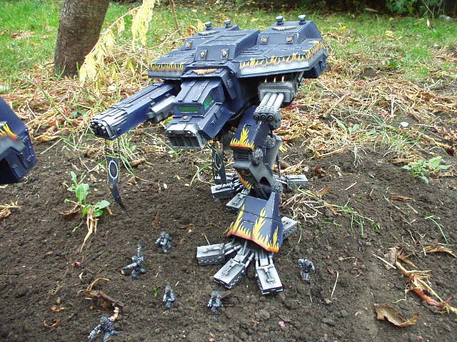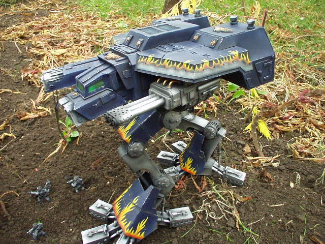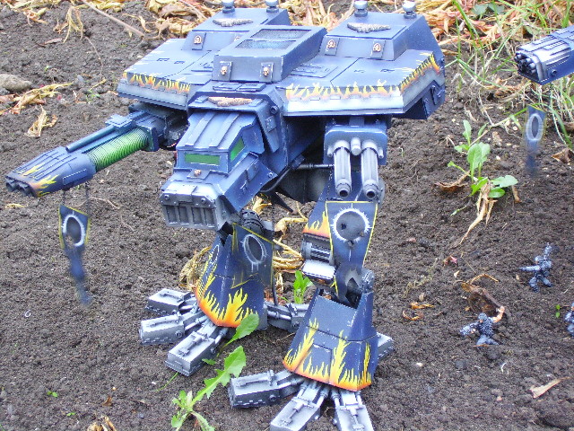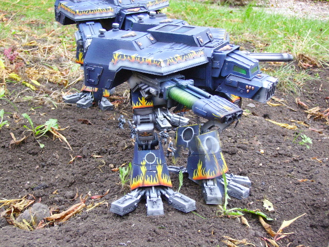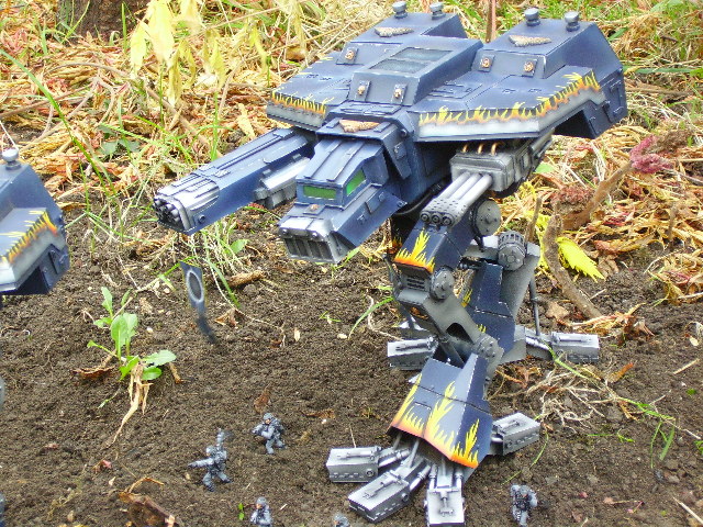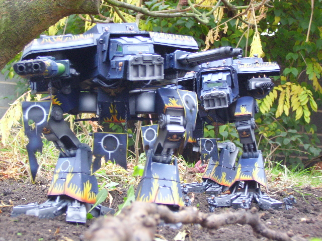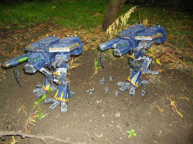 These are both scratch-built using cardboard and plastic. Took a weekend to build the 1st then a couple of days to complete Warhound no2. I kept the paint scheme relatively simple relying on there size to impress on the battlefield, in fact they were painted from undercoat in a couple of afternoons!!
