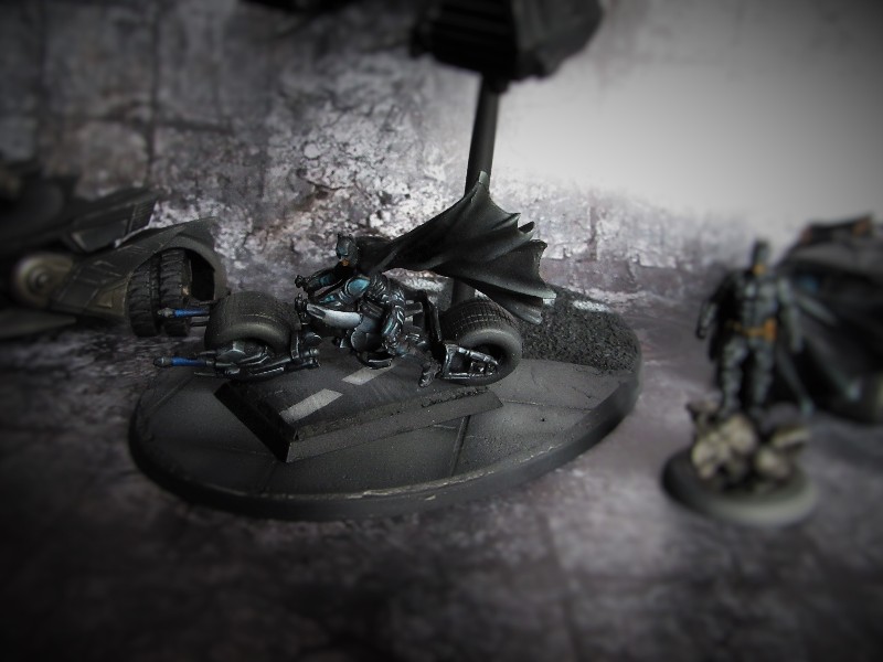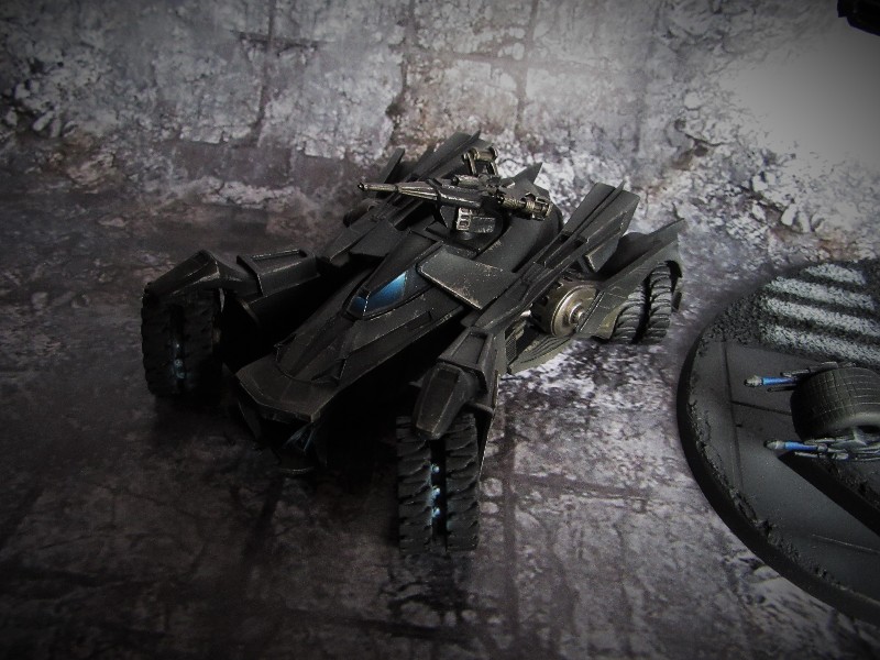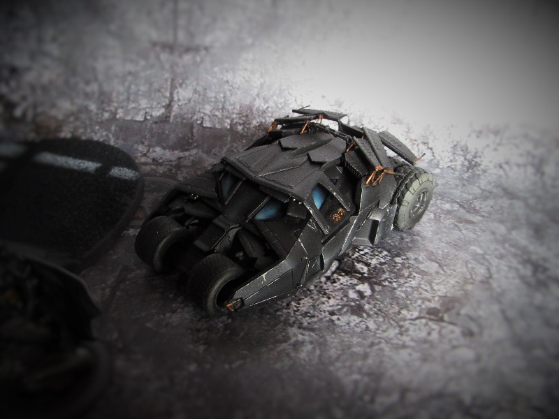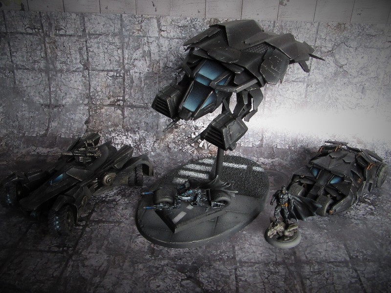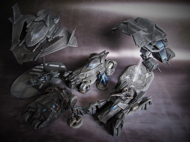 Thought I would start with a few funky vehicles because what's Batman without his Gadgets! Knight Models batmobile, hotwheels tumbler and I picked up the batplane dirt cheap as there were no pods attached. Quick bit of plastic card magic and voila..nice scale batplane! Time to paint!