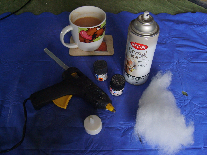 Quite a number of people have asked about the 'glowy' kill markers I use too. While there are many different ways to go about making these this is one of the simplest ways, honestly takes MINUTES! Basic tools as shown, little battery powered tea lights, some polyester cushion stuffing, glue gun, spray varnish and grey/black paint