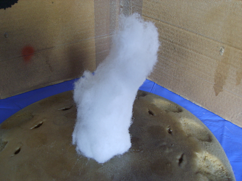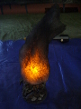 Give the whole thing a good spray of varnish (I use gloss, the stuff you can buy from any good hardware store) this will stiffen up the fibres giving them the consistency close to candy floss (doesn't taste as nice...I tried!) Once dry you can re=shape a little if you prefer, the varnish makes the whole thing a little more robust. last job is to simply spray the smoke column dark grey/black. Keep it quite light towards the bottom so the 'flame' shows through but lay it on heavy towards the top THAT'S PRETTY MUCH IT!!! Now darken the room, switch on the tea light and prepare to be hypnotised by the flickering column of DOOOOM! |