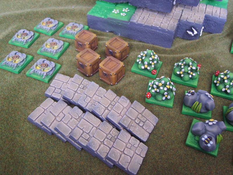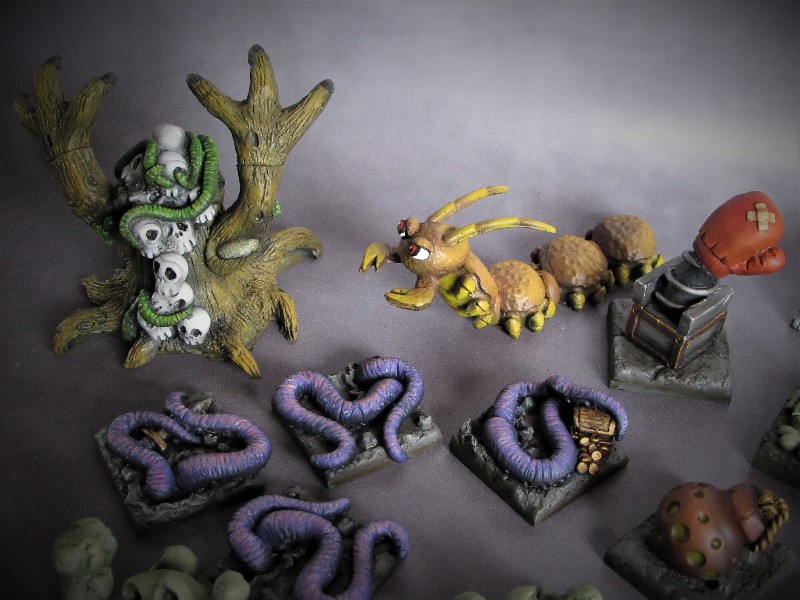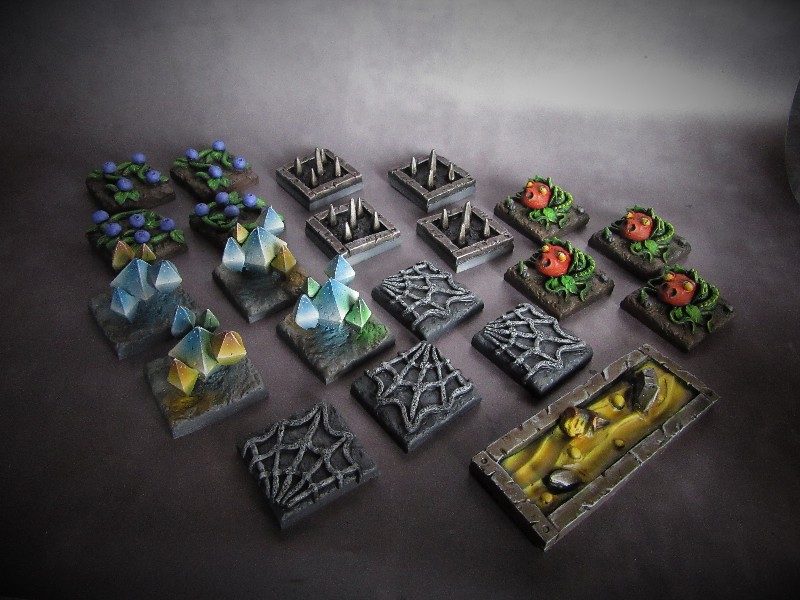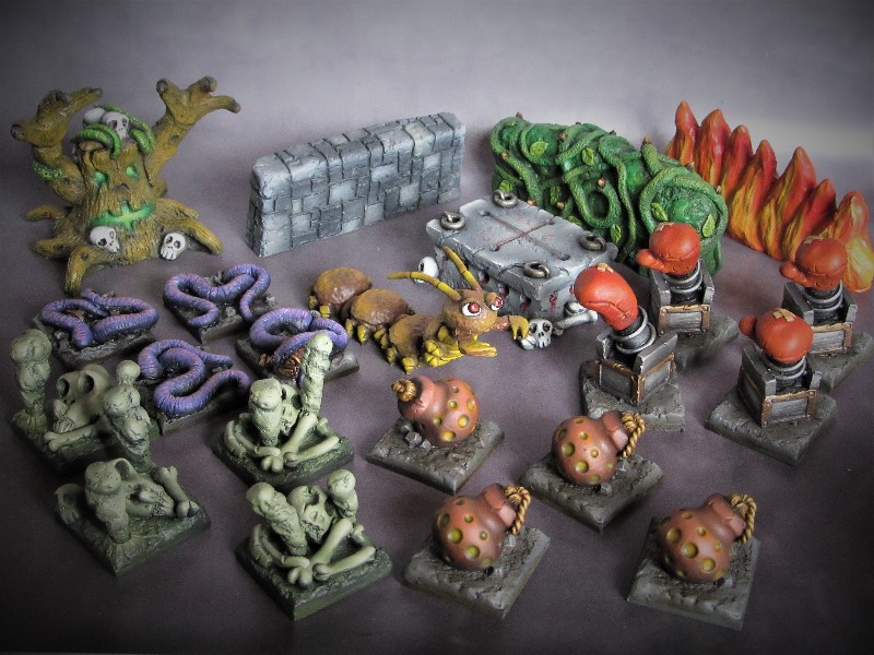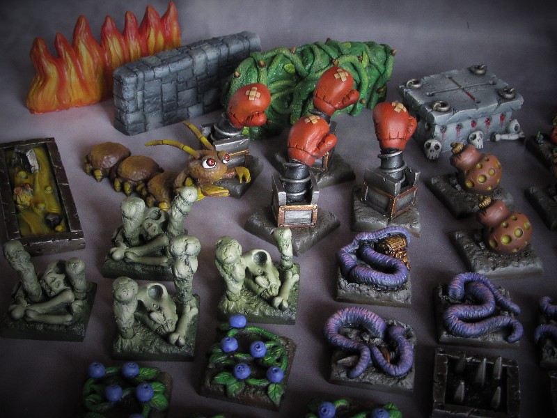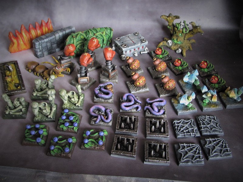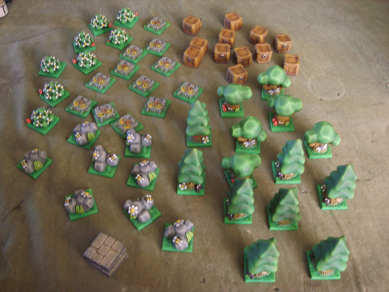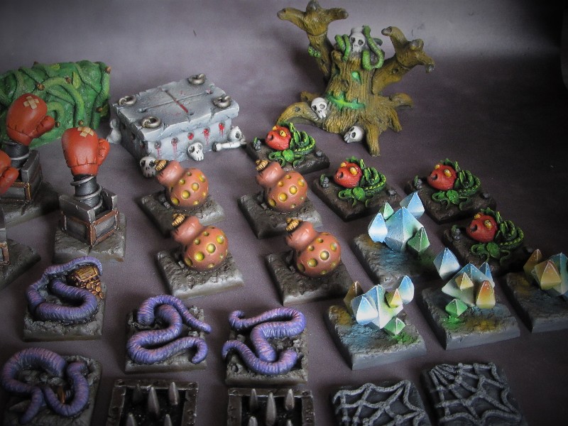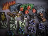 Two types of trees, snozzleberry bushes, boulderlumps, crates and Demon tiles all sculpted and painted!