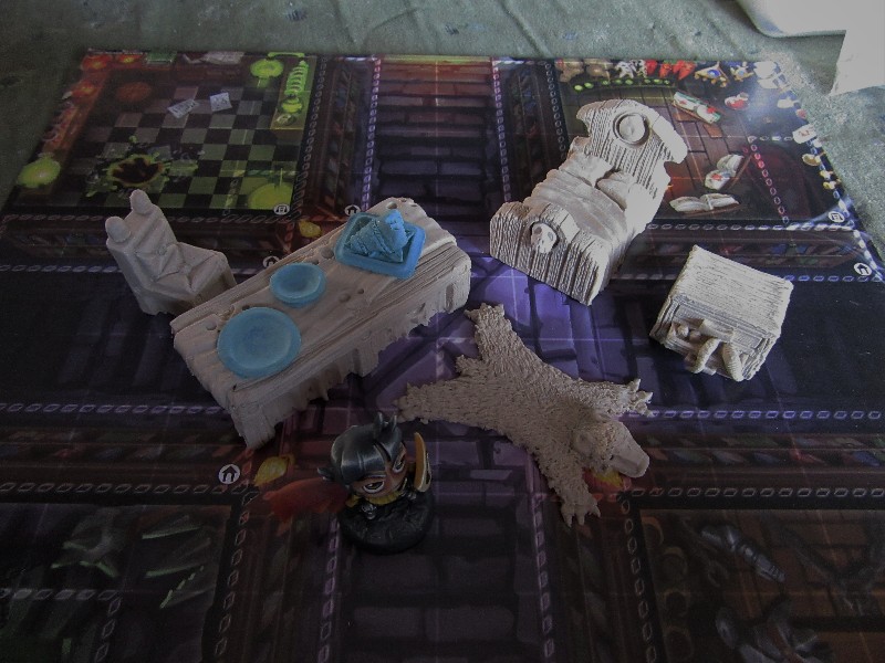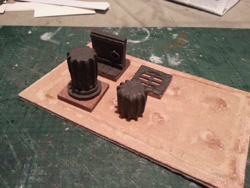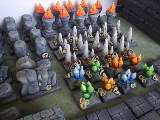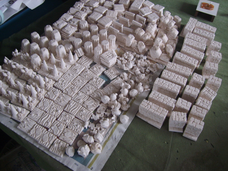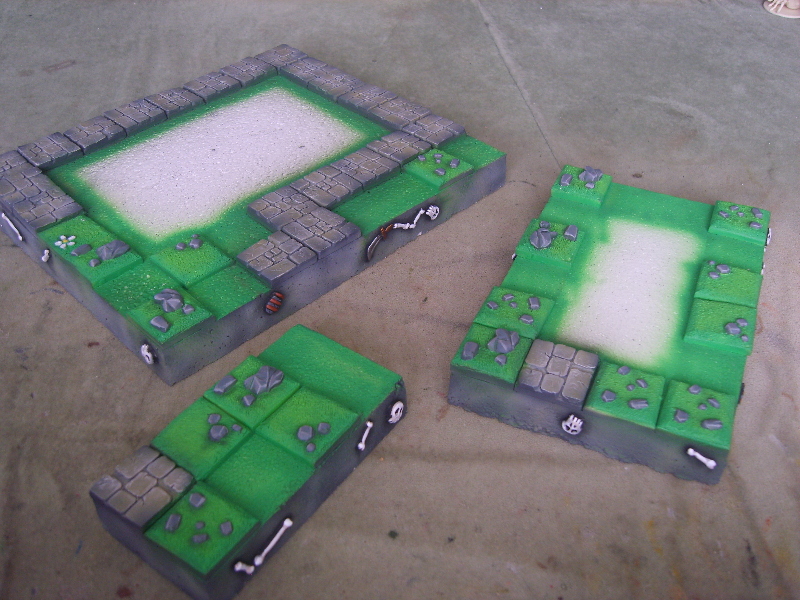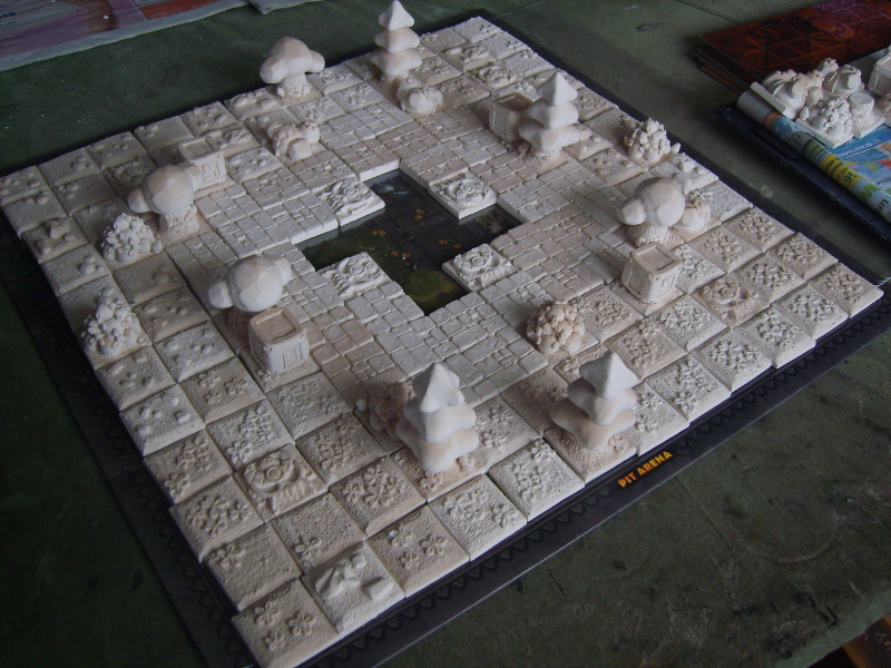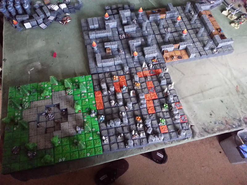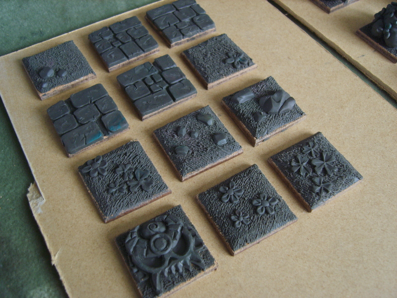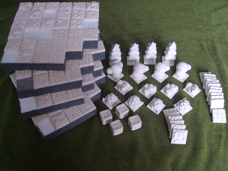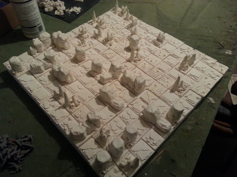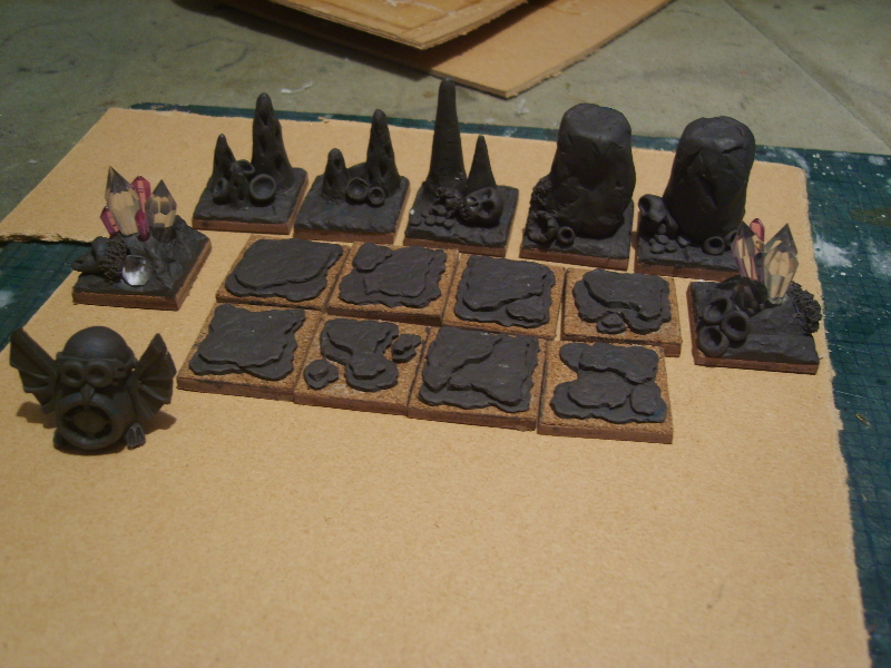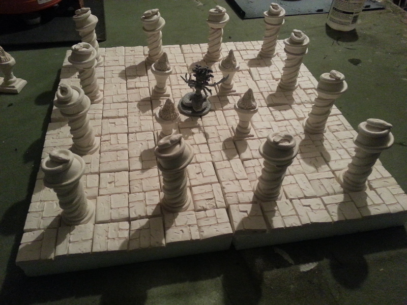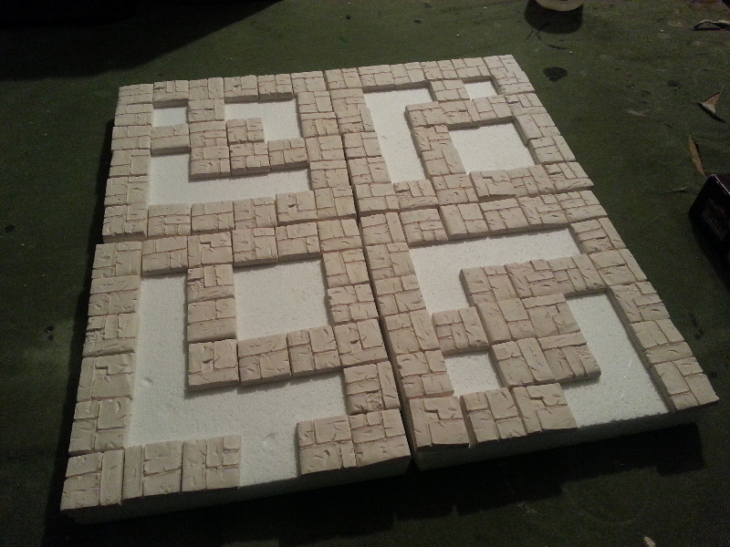 Started to make up some boards. Cavern and dungeon zone here, like the original outside zone all 'sticky up' bits are removable and each 12x12 square board is split into 4 quarters allowing for a great degree of variable setups. Probably sculpt a slightly different floor tile set and some different columns for a final dungeon zone then its onto painting!