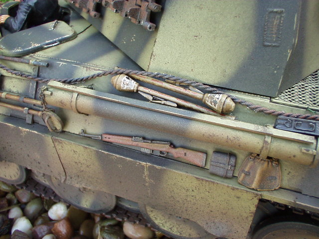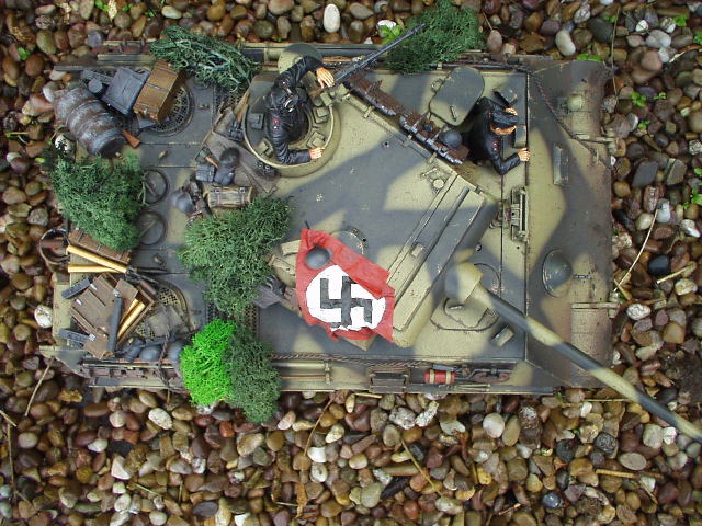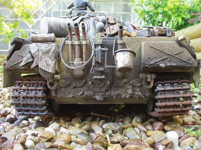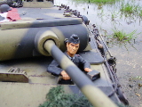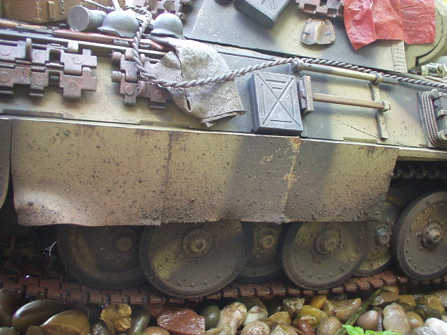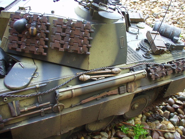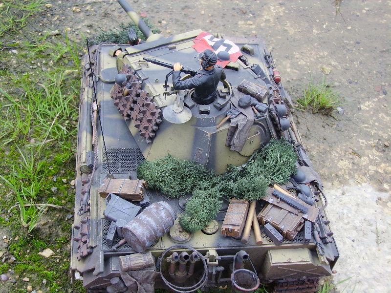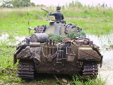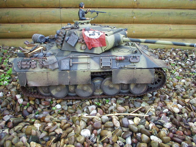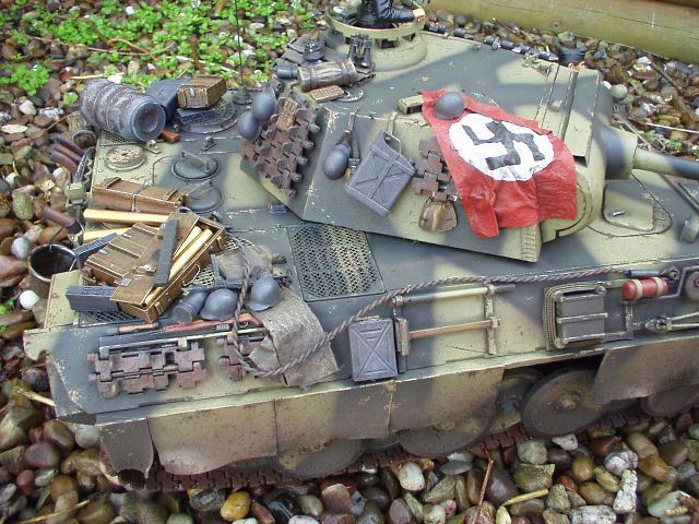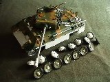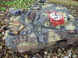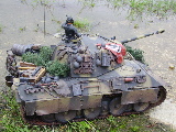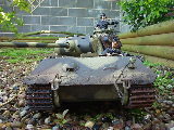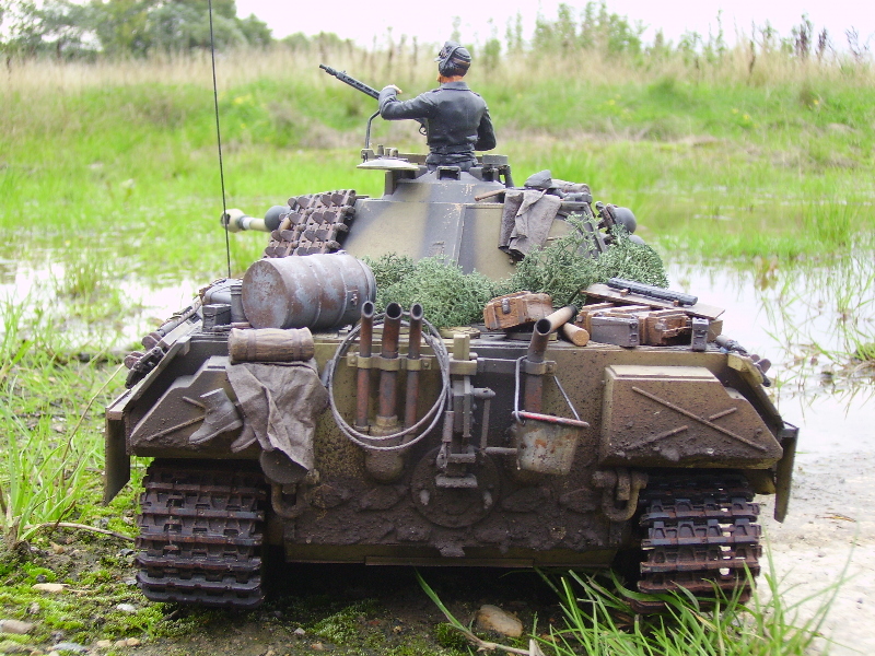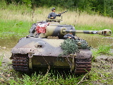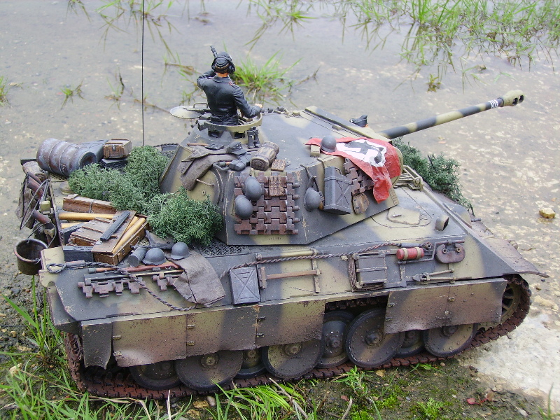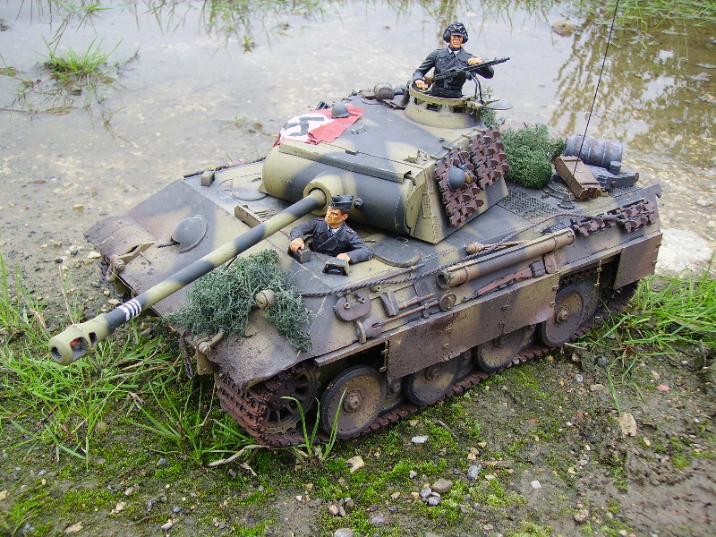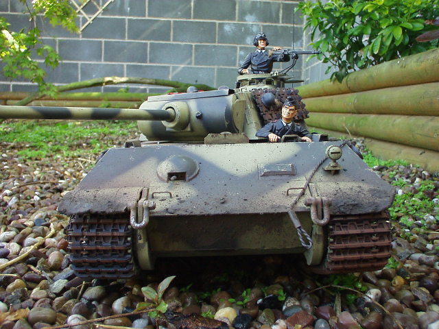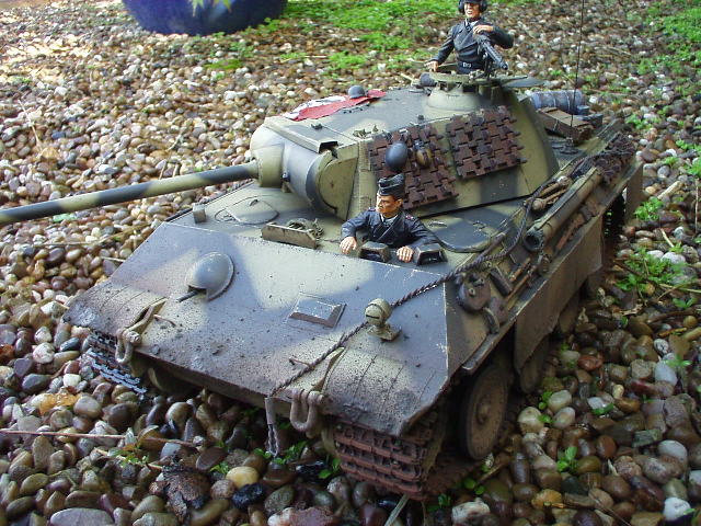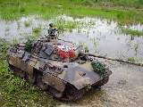 Panther Athough it had a disastrous combat debut, the Panther matured to become one of the best all-round German tanks of the war. Conceived as a response to the Russian T-34, the Panther featured sloped frontal armour, wide tracks, a powerful engine and a good gun. As a result, it had good mobility, especially on rough terrain, and was available in large enough numbers to make a difference in many battles' The model below is based on the Hen Long RC kit, ripped all the internals out, replaced them with the Tamiya King Tiger parts. A bit of modding here a dash of paint there and you have yourself a reasonable 1/16 Panther, close enough to pass my low standards anyhow ;O) features - turret rotation, gun traverse and recoil, muzzle flash, battle system and working, throttle linked exhausts! For a more accurate model check out the new Tamiya Panther here! |