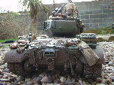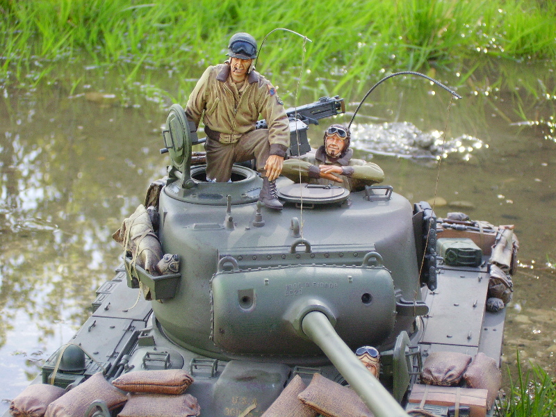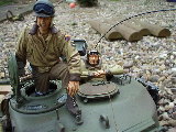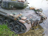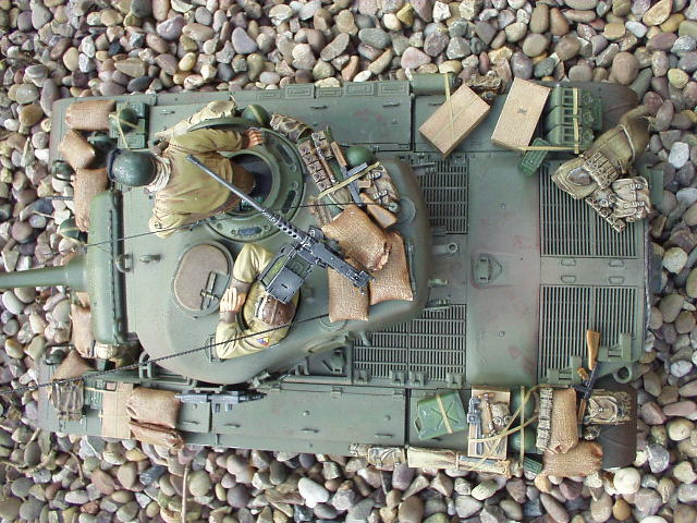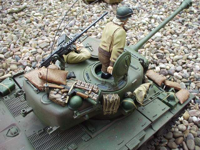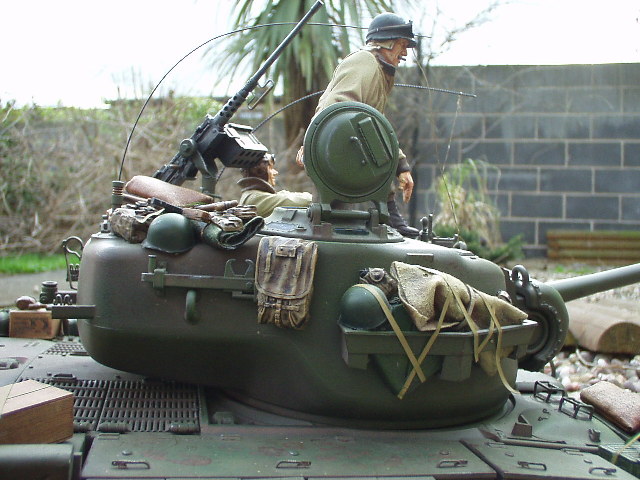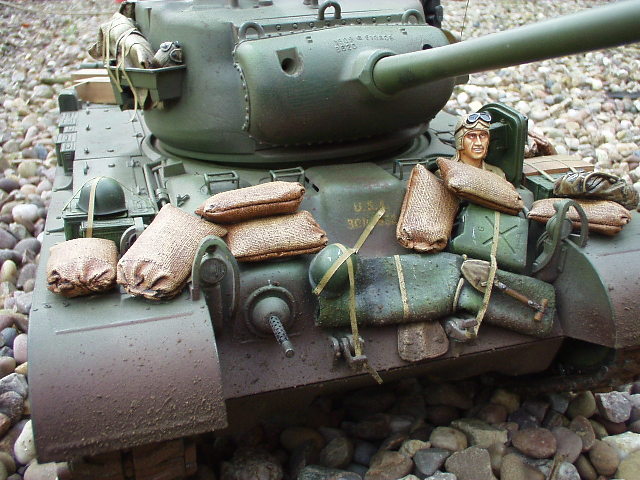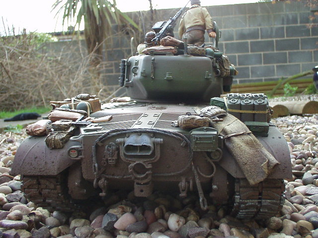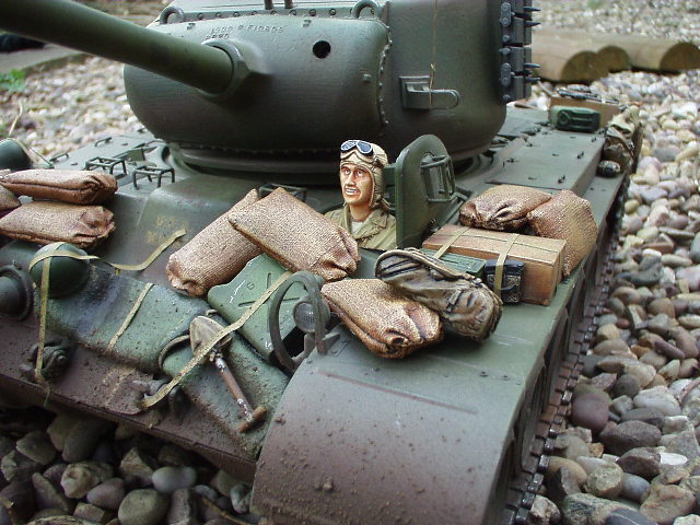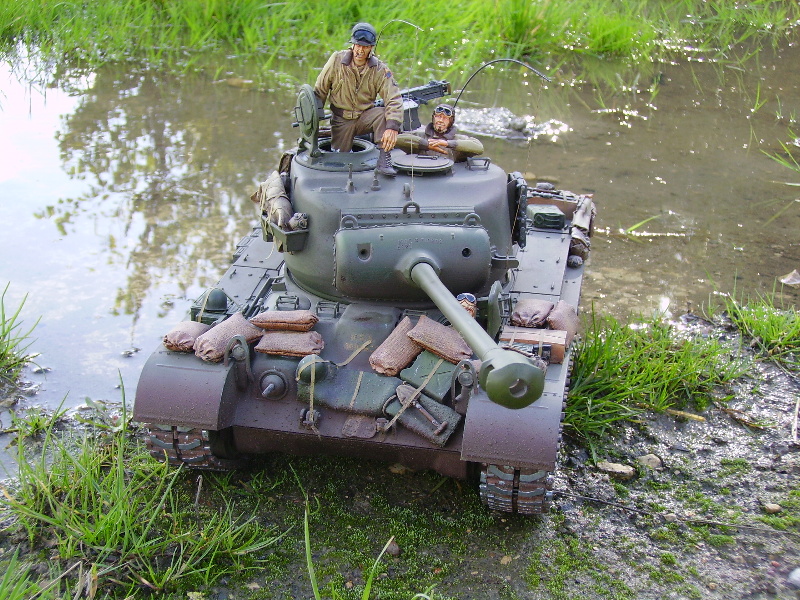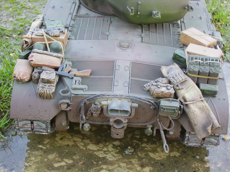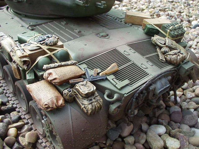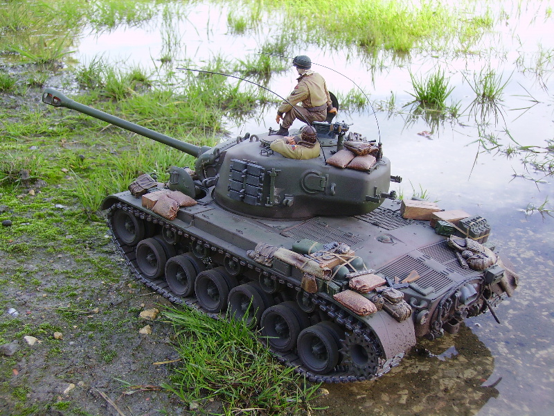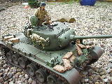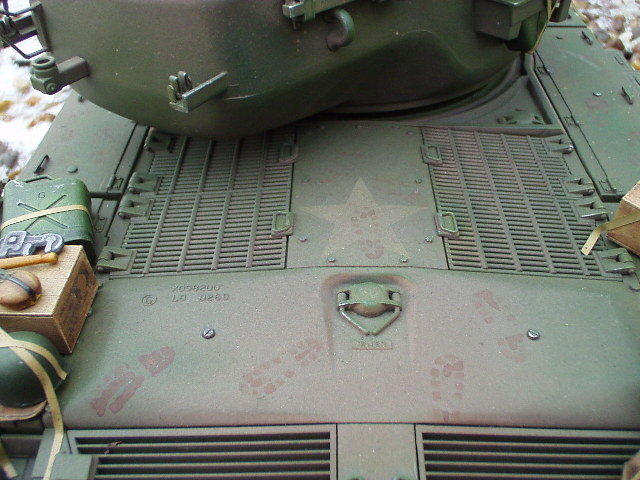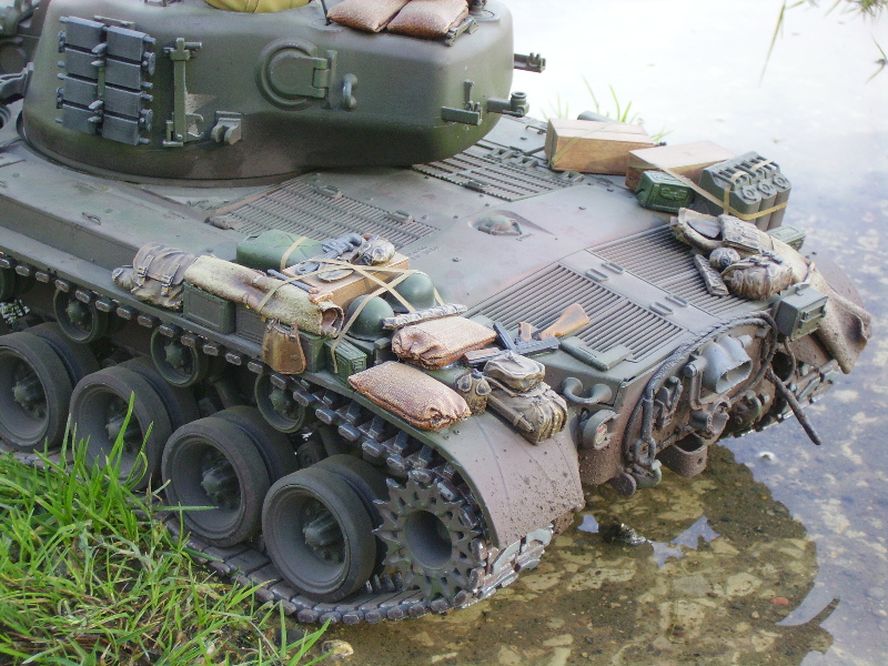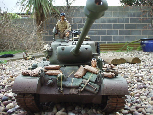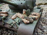 M26 Pershing January 1945, as the U.S. forces were planning their advance into Germany, a long awaited new tank arrived at last. For the U.S. forces who had suffered dearly under the might of the German armour, at last came a tank that promised to hold up against teh wrath of the German Tiger and Panther tanks. After the outbreak of the Korean war in 1950, this tank would take on Soviet T34/85 tanks in fierce armour to armour combat. This tank, which was on the forefront of mechanized combat technology of its time and reigned supreme in the world of armour was, was the M26 Pershing ABSOLUTELY love this little fella, IMHO the best WWII tank kit tamiya has to offer. Superb performance and a great looking model..go buy one now!!! NOTICE the footprints on the rear engine deck. I actually cut glued foam onto the sole of a 1/16 boot then cut the tread out with a craft knife, then a simple process of 'potato printing' it onto the tank (yeah, I know, I gotta get out more) :OP |