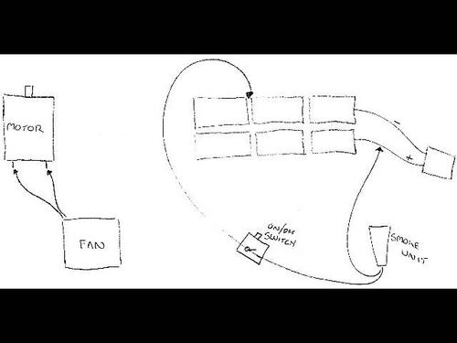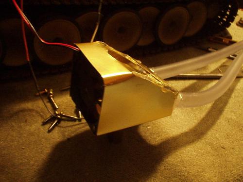 Step 1 Ok, first things first. Connect the fan to the motor terminals. run the tank at full revs, if the fan works, well done! If it doesnt swap the wires around. You may find it useful to remove the tracks or chock the tank up so they are not in contact with the ground as you can easily test run the model as you build. next, we are going to wire the smoke generator directly into the tanks 7.2 battery. connect one wire directly into the red (positive +) wire (slice into the insulation and twist the wire open, insert your smoker wire and it should hold fine, secure with insulation tape) Now take the other wire and connect it via an on off switch between cell 4 and 5 of the battery. You will probably have to trim away the cardboard or plastic cover to access the cells, gently prize the cells apart and insert the wire, you may find it useful to 'fatten' the end of the wire up with a little solder for a tighter fit. Secure with insulation tape. give the smoker a whirl, make sure it works! Be very careful not to touch any exposed wires together as this will short out the battery! *hint* its a good idea to extend all your wires at this point to allow your self a little more room to manouvre, any excess can easily be tucked away after everything is in place