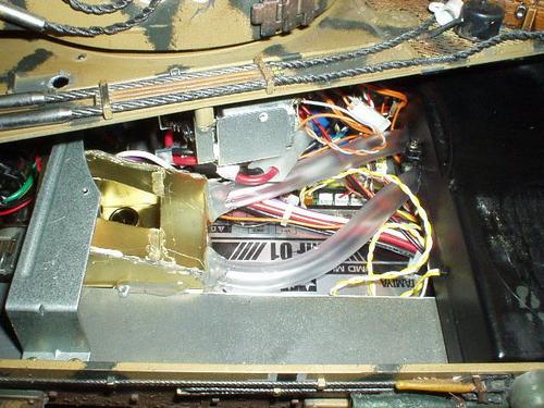 Step 5 The unit sits quite comfortably under the hull support brace. You may have to move the MFD unit back slightly to allow the smoke generator itself to seat right. Take the speaker box apart and drill two holes for the tubes to enter and lining up on the holes in the rear wall drill two exit holes. Use a pair of long nosed pliers to help pull the tube through and up inside the exhaust shields. Although not accurate I personally prefer the smoke to come straight out of the tubes and shoot up into the air. This looks way cooler than when the baffles are on, take my word for it! |