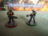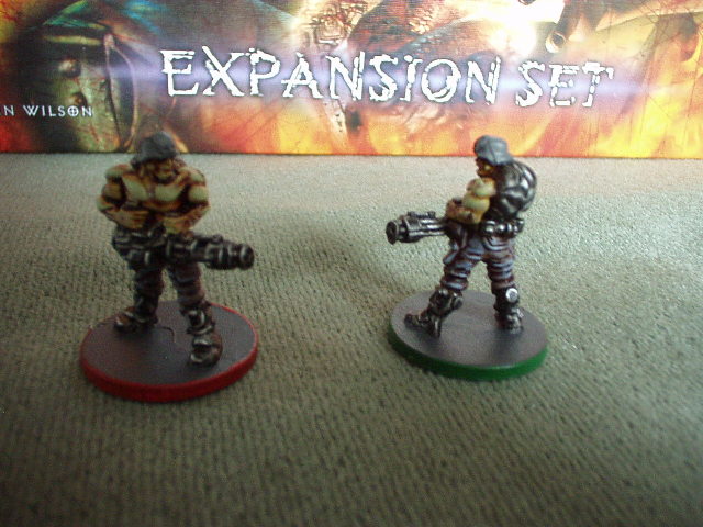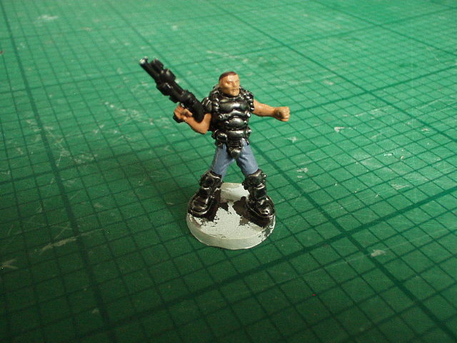 Step 1 base colours are first painted, I chose GW bronzed flesh for my figures, all the 'metal' parts are picked out in GW boltgun metal, don't worry about being too neat at this point as the wash tends to bring the colours together. The whole figures are then 'washed' with GW flesh wash ink. This is quite simply painted over the whole base colour and allowed to settle in the recesses, you will find it really helps to bring out the detail.