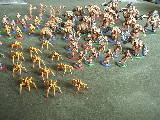 Step 2 Once dry the figures are then drybrushed, choose a large soft brush and dip it in your paint (the original base colour of bronzed flesh in this case). Wipe the excess from the brush using a piece of kitchen towel until the brush is nearly dry then simply 'dust' the whole figure, you will find this brings out the raised details of the figure as well as creating a basic illusion of light and shadow. Keep practicing and you will soon learn how much pressure to use and where to apply :O) |