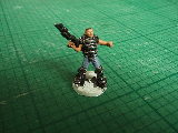 Step 3 The next thing to do is to 'fine-line' the miniature. All this entails is using a small, fine brush to pick out the raised areas of the model in a lighter colour. This in effect brings out the detail and creates the illusion of light against the darker recessed areas. I recommend adding a little water to the fine-line colour to make it easier to work with, thick paint always works against you at this stage. Try to experiment, you will soon find that you develop an eye for just where thise lines have to go. The colour I chose to fine-line was GW bleached bone, always try and use a colour lighter than the base coat and if possible one which you do not have to mix, this saves a lot of time! |